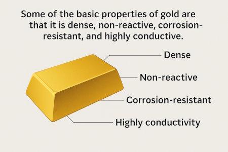 Some of the basic properties of gold are that it is dense, non-reactive, corrosion-resistant, and highly conductive